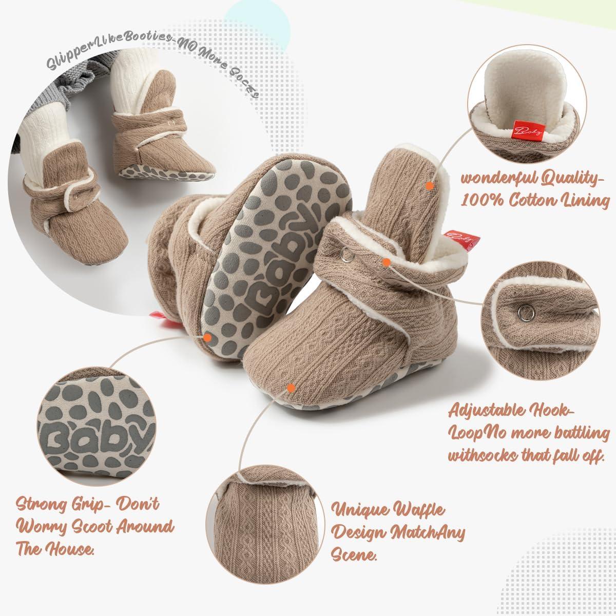 Infant Baby Boys Girls Cozy Fleece Booties Stay on Slippers Non Slip Soft Gripper Sock Shoes Toddler First Walker Newborn Crib Birthday Shower Gift(F/Light Brown)